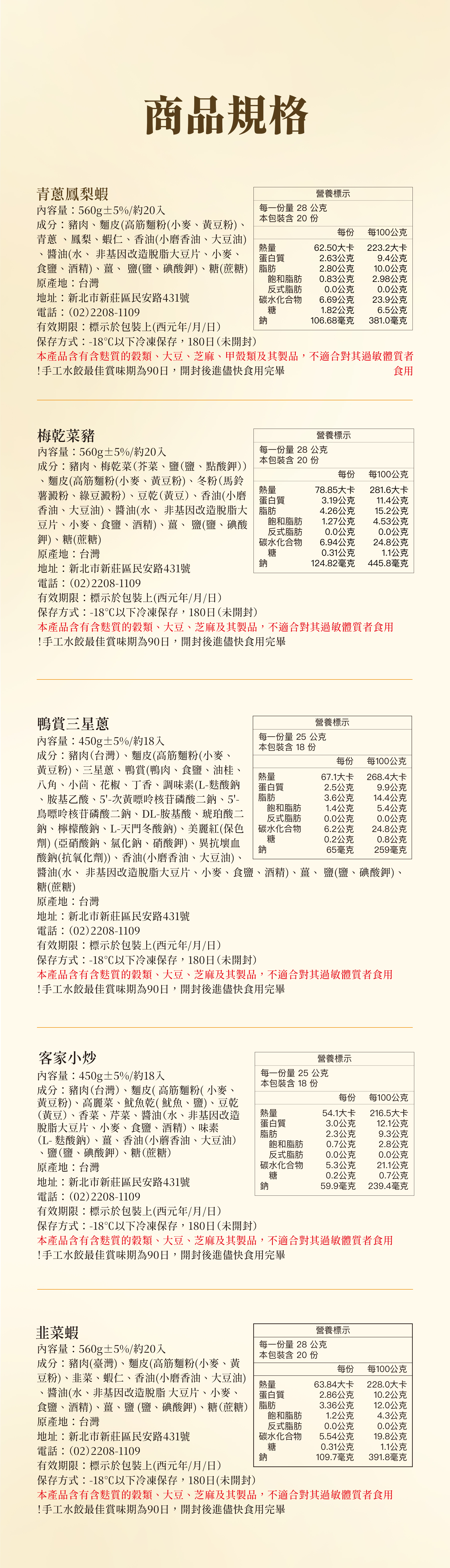 ●12包含青蔥鳳梨蝦*1+梅乾菜*3+客家小炒*3+三星蔥鴨賞*3+韭菜蝦*2