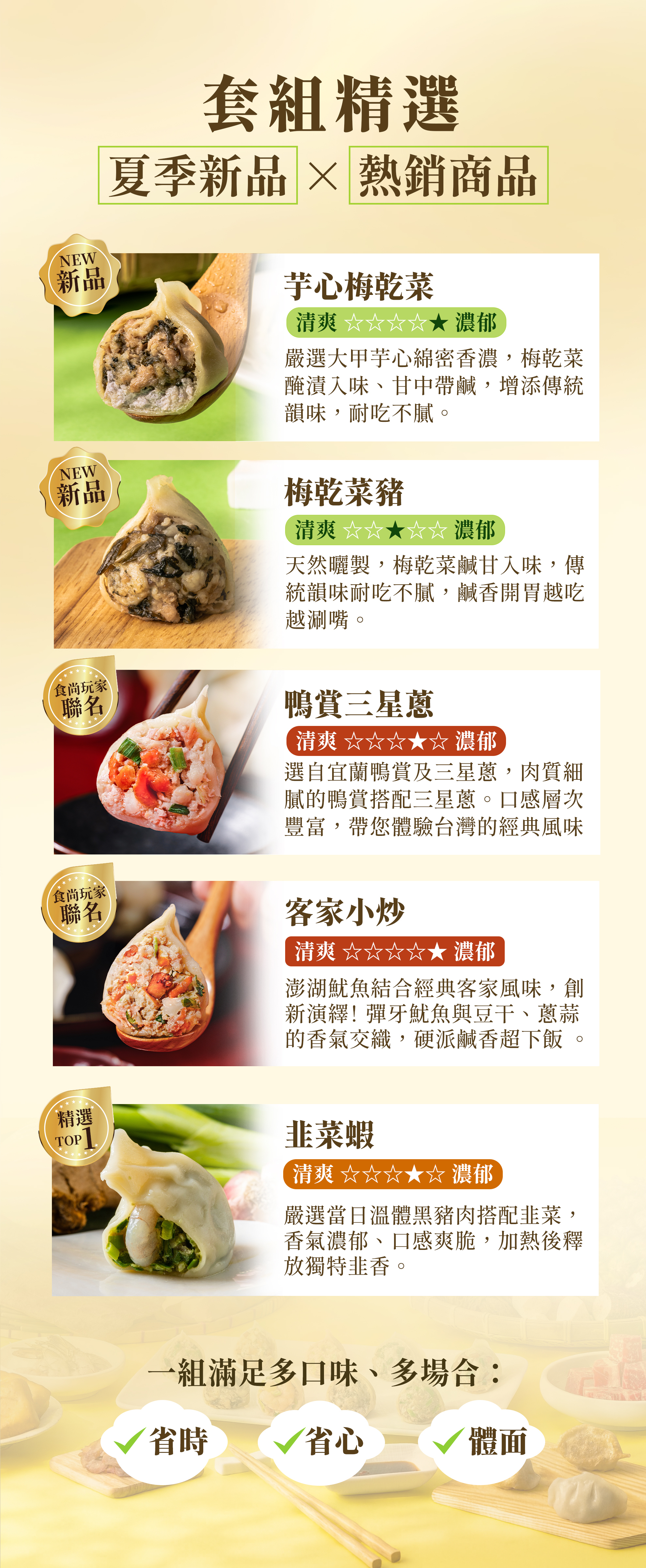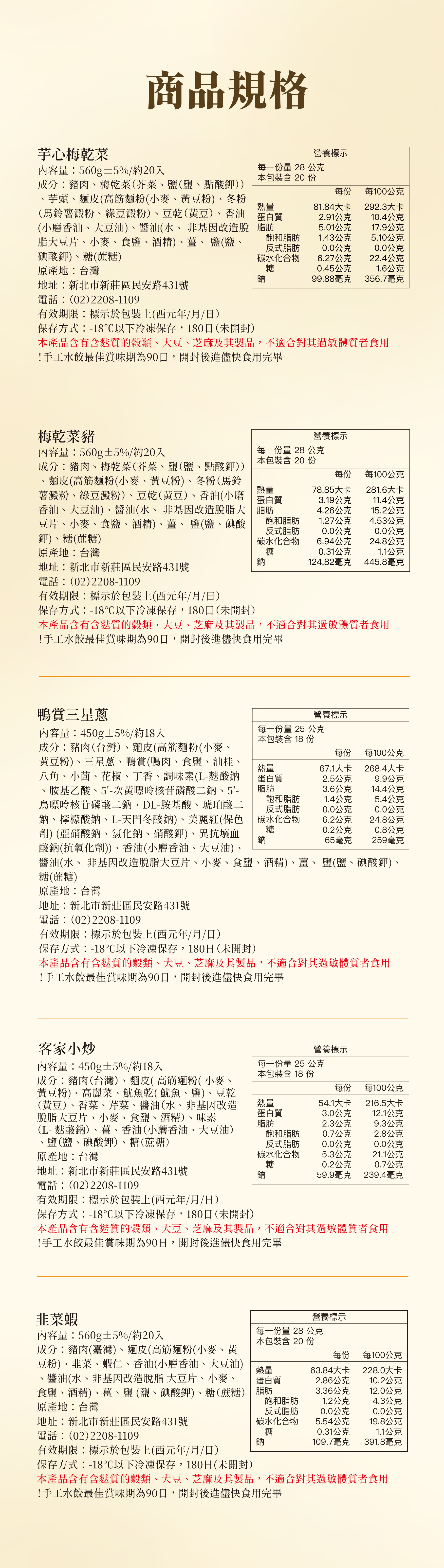 ●8包含芋心梅乾菜*1+梅乾菜*2+客家小炒*2+三星蔥鴨賞*2+韭菜蝦*1