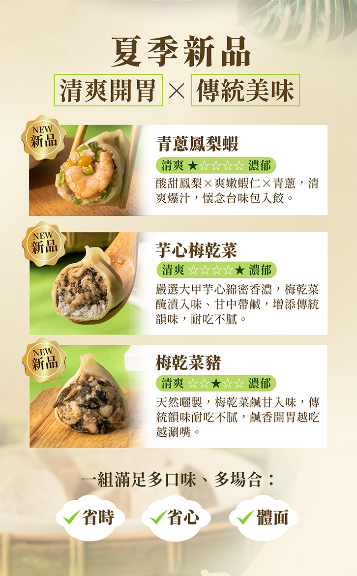 ●全新開發三口味:青蔥鳳梨蝦球、芋心梅乾菜、梅乾菜